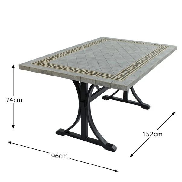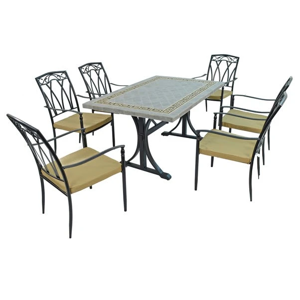 This stunning and stately 6 seat dining table features smooth ceramic hand-laid tiles on both its top and edge. The heavy table top is supported by strong steel legs which are powder coated black leaving a smooth and slightly glossed finish. The Ascot Chairs are a deep-seated stacking chair that has a robust frame and the decorative ornate backrest that would look great alongside any grandiose table either indoors or outside. The black finish is slightly glossy and helps to protect from the elements. The chairs also feature slightly textured cushions. This set requires minimal assembly, simply attach legs to the brace and then the whole leg set to the top using enclosed Allen key and fittings.