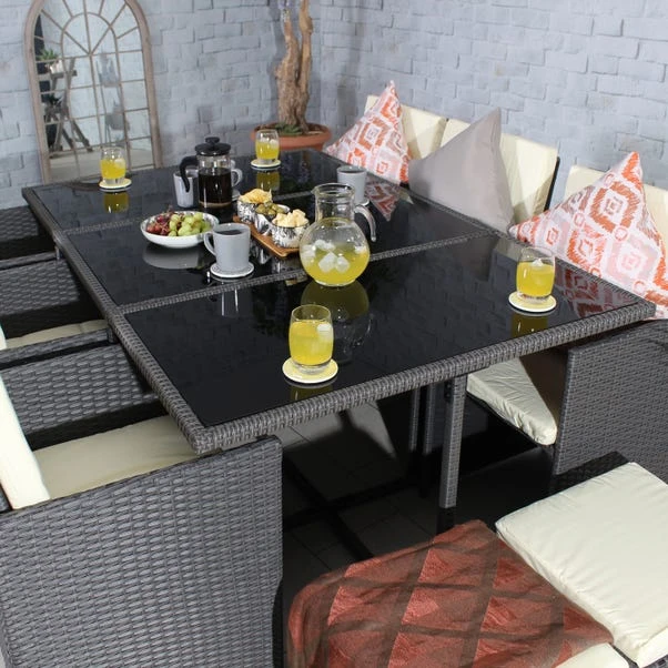 This Cannes 10 Seater Cube Set has a space saving design in a contemporary grey colourway that is perfect for any garden style. Crafted with a steel frame and a glass panel table top, this set is ideal for outdoor dining during the summer months. The footstools can be used as additional seating and the chairs each have folding back rests which provides you with extra comfort when seated.