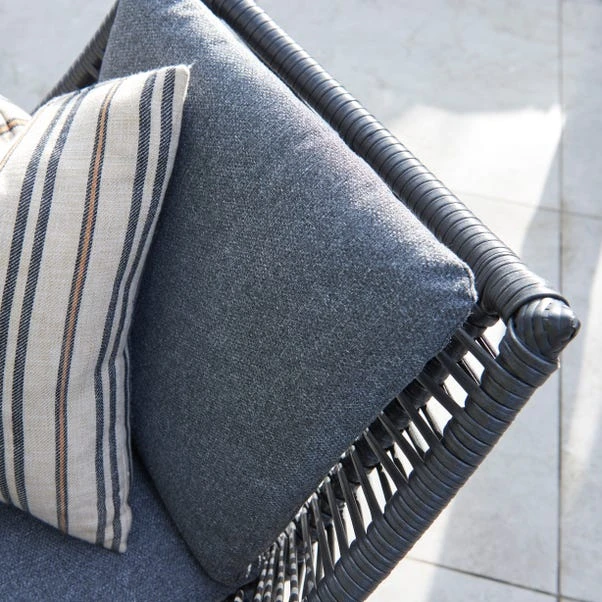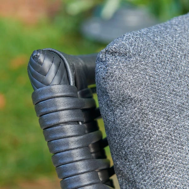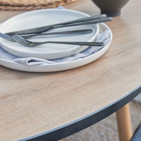 The Keswick 4 Seat Dining Set combines elegance with practicality for outdoor dining. The spacious table accommodates four diners, ideal for gatherings, while black flat wicker seats offer lasting quality and comfort. The wood-effect legs are waterproof, eco-friendly, and resistant to wear. The Beech SPC table top is waterproof, durable, and provides a natural wood look. Dark Stone Grey cushions ensure a comfortable dining experience.
